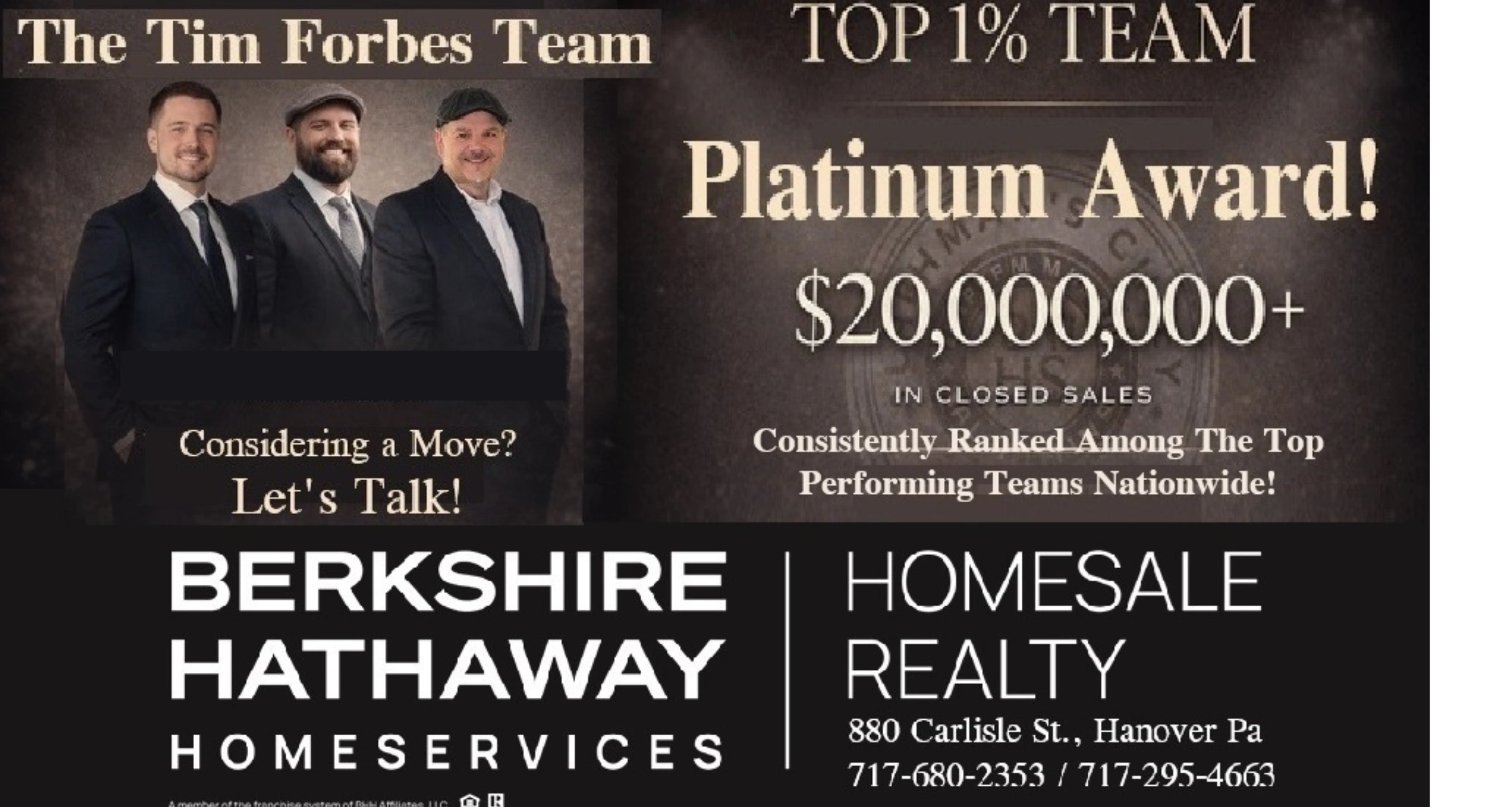 Tim Forbes (717) 680-2353 - Cell (717) 295-4663 - Office TimForbes@Homesale.com Chris McCarter (717) 681-4891 - Cell (717) 295-4663 - Office CMccarter@Homesale.com Damian Martinez (667) 788-8289 - Cell (717) 295-4663 - Office DMartinez@Homesale.co